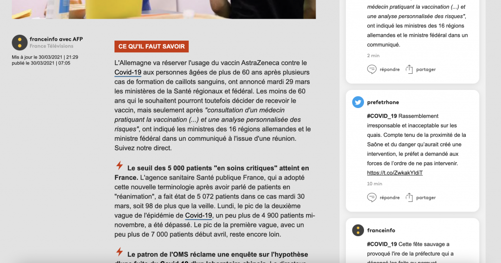 Franceinfo va un peu plus loin : le contenu principal de ses pages « live » est cette fameuse synthèse, tandis que le flux chronologique est relégué dans une colonne secondaire sur desktop. (Sur mobile, c’est l’inverse).