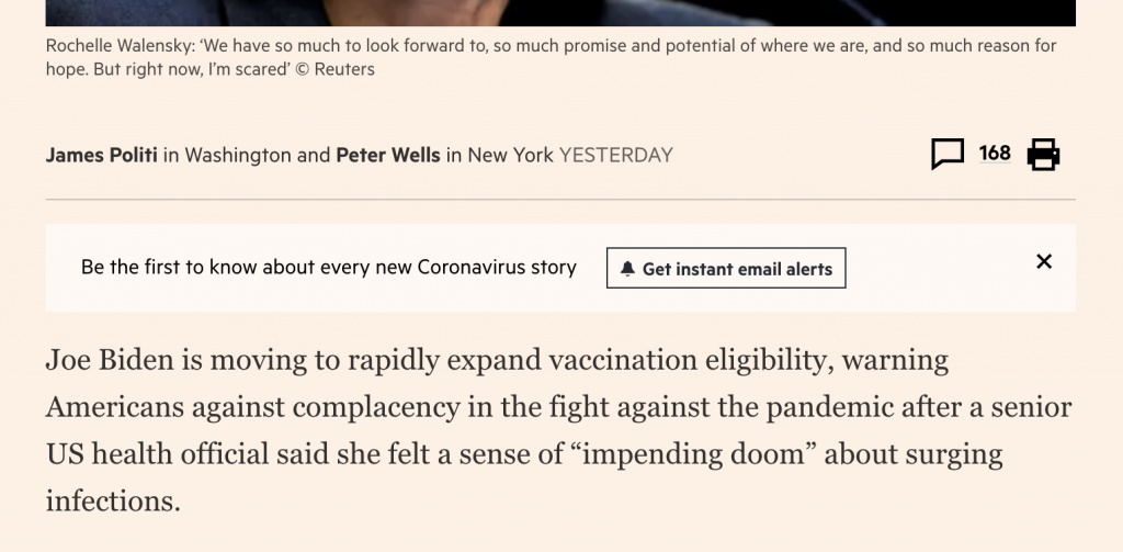 Chez le Financial Times, il est aussi possible de s’inscrire à des alertes par email sur certains gros sujets comme le coronavirus. Mais gare à l’overdose : vu le nombre d’articles publiés sur ce sujet, on espère cependant qu’un tri est effectué…