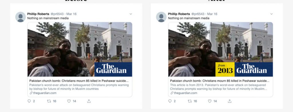 Encore plus important : ce système de « timestamp » s’applique aussi aux publications du journal sur les réseaux sociaux. Un encart jaune est automatiquement ajouté sur la vignette de l’article dès qu’on souhaite le poster sur une plateforme. Le Guardian met d’ailleurs à disposition son code en open source pour tout média qui souhaiterait s’en emparer.