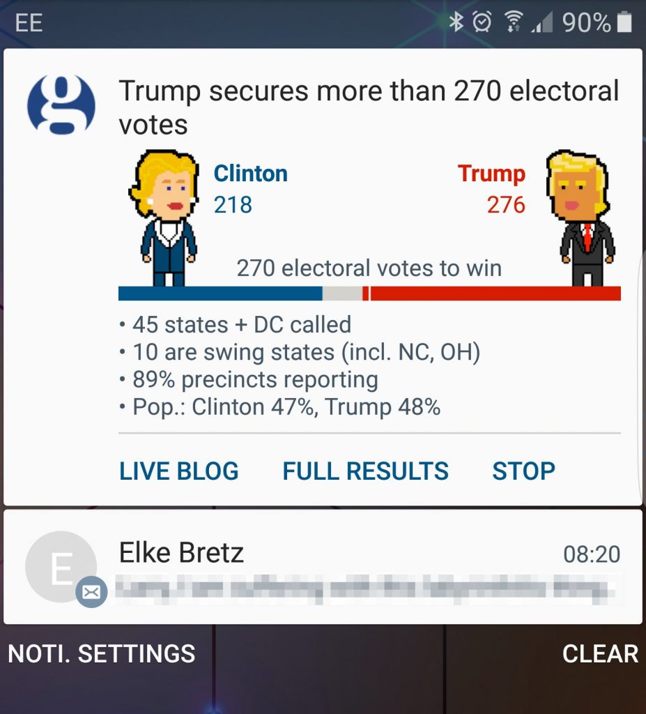 Pour éviter justement de spammer les utilisateurs, le Mobile Lab du Guardian a également expérimenté le principe d’une notification push mise à jour en continu (plutôt que de multiples notifications à chaque évolution). Une bonne idée testée sur Android en 2016 mais visiblement pas très au point sur iOS : lors des élections américaines de 2020, un souci technique a précisément déclenché une avalanche de notifications intempestives chez les utilisateurs…