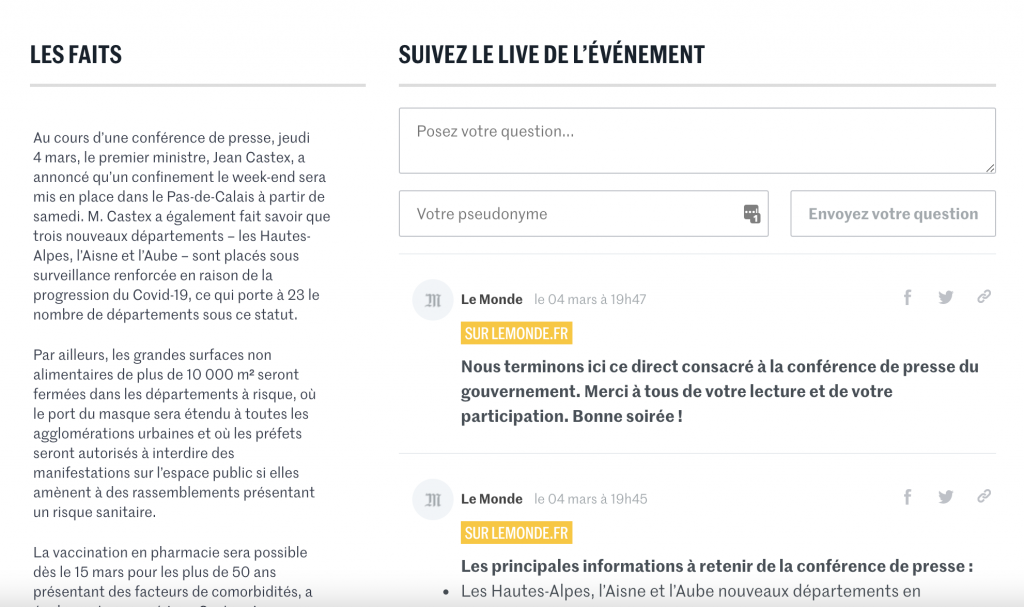 Le Monde le propose par exemple avec une colonne « Les faits » dédiée au récap de l’événement en cours et régulièrement actualisée.