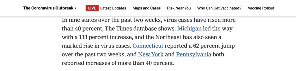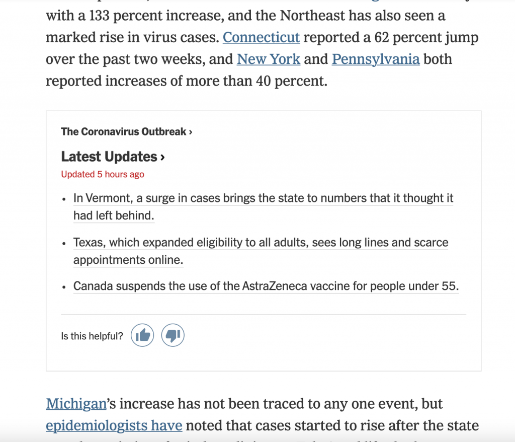 Lorsqu’un live est actif, le New York Times le promeut aussi dans ses nombreux articles à l’aide d’un module qui présente les dernières mises à jour. Tout cela contribue à un excellent maillage éditorial.