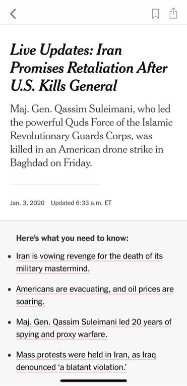 Au-delà du seul format « live », le New York Times a aussi imaginé une barre de raccourcis éditorialisée pour tous les événements majeurs. Celle-ci est généralement déployée dès qu’un événement (prévu ou impromptu) survient, et permet de valoriser différents angles complémentaires sur cette même actualité. Le tout est mis à jour en continu, en signalant les nouveautés avec un petit label « New ».