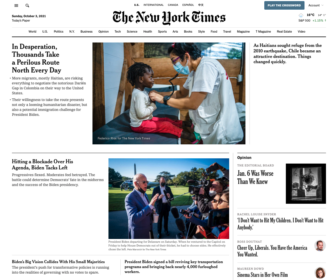 Mais il faut aussi s'intéresser aux pages d'accueil, qui sont des vitrines symboliques où les lecteurs ont besoin de repères. Il peut ainsi être intéressant de délimiter un espace clair pour les contenus d'opinion. C'est ce que fait par exemple le New York Times avec une colonne dédiée.