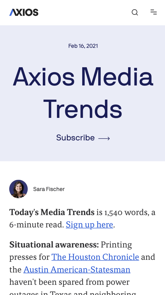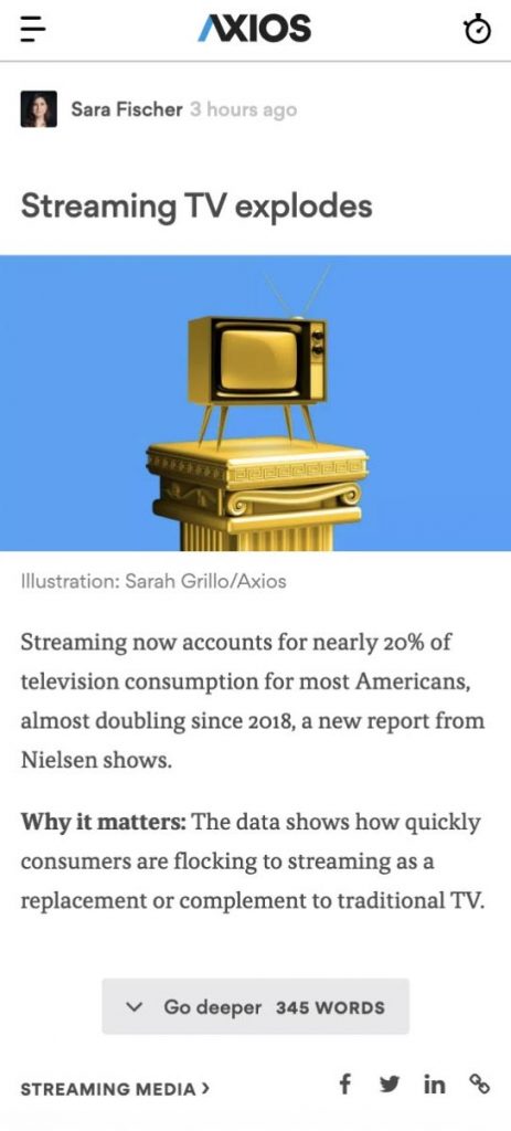 Le site initial d’Axios est également allé plus loin en proposant une page d’accueil conçue comme un flux : les articles y étaient consultables directement, dans un format « dépliant » assez unique. Très pratique à l’usage, il a malheureusement été abandonné lors de la refonte du site en 2020 (plutôt pour des raisons de monétisation que d’expérience utilisateur…). On regrette fortement ce concept !