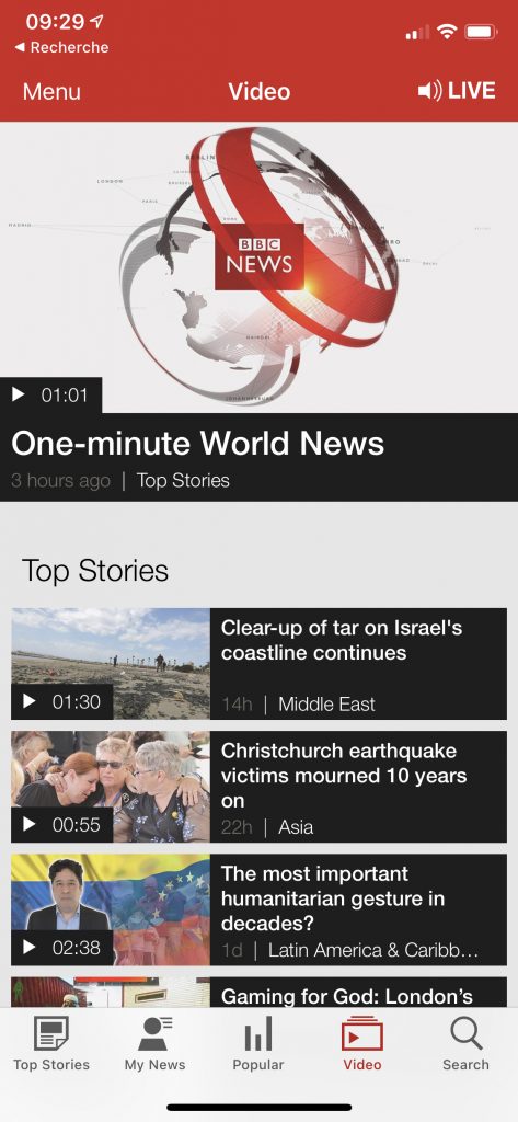 Les médias télévisés ont aussi l’habitude de produire des JT même si leur format les rend assez peu adapté à une consommation numérique. Cependant, certains sites d’information ont adapté les codes des JT pour les nouveaux usages, à l’instar de BBC News qui propose un flash vidéo très court (1 minute), mis à jour en continu et assez visible dans son application.