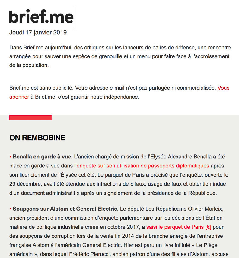 Le format newsletter est le plus fréquemment utilisé pour les formats « brief » ou « catch-up ». De nombreuses info-lettres promettent un récap de l’actu quotidien, mais seules celles qui sont véritablement éditorialisées valent le coup d’oeil. Elles sont très écrites, souvent « incarnées », et permettent réellement de se mettre à jour en quelques minutes (sans avoir à cliquer sur dix liens).