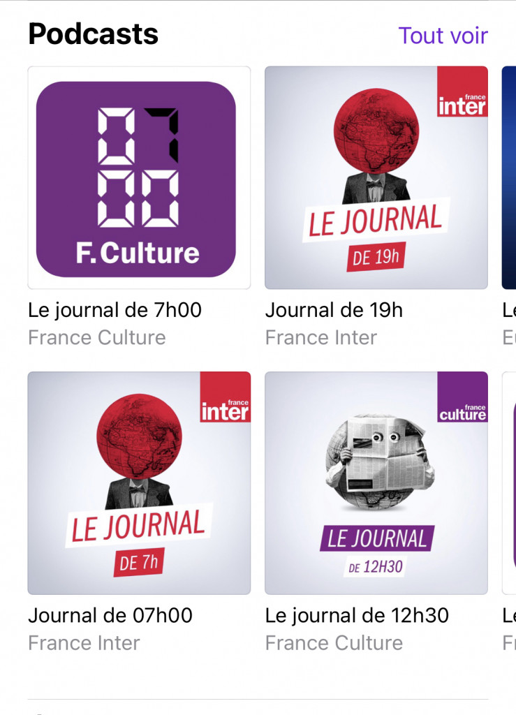 Les journaux et autres flashs info issus de la radio sont aussi un bon rituel qui peut être consommé à la demande. La plupart des radios diffusent leurs journaux en version podcast, même si l’on sent que l’editing est parfois moins soigné que pour les émissions phares (pas toujours de sommaire visible). D’autres médias non issus de la radio se lancent aussi sur ce créneau, comme Hugo Décrypte.