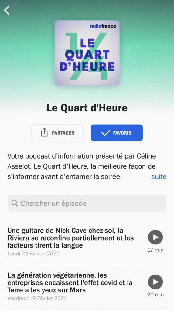 Au-delà du traditionnel journal, de multiples formats sont possibles : Radio France a lancé récemment un podcast natif quotidien, volontairement court (« Le Quart d’heure »), qui fait le choix d’aborder trois sujets uniquement.