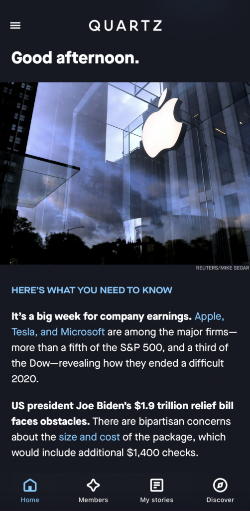Et si on pousse le concept, pourquoi les pages d’accueil ne seraient pas conçues complètement comme un brief éditorialisé, plutôt que comme une liste d’articles froide et mal hiérarchisée ? Des premiers exemples sont visibles chez Quartz, qui a décidé d’utiliser son brief quotidien comme contenu principal de sa page d’accueil. C’est audacieux, mais surtout clair et efficace. De quoi booster les visites directes vers la page d’accueil.