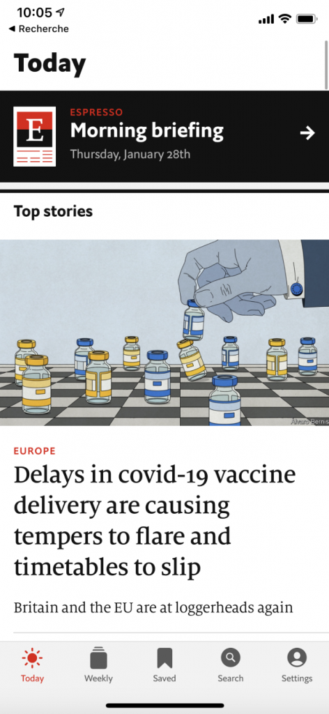 L’enjeu est aussi de les rendre accessibles : au NYT, c’est carrément le premier élément visible sur la page d’accueil web, en version desktop. Dans l’application de The Economist, le brief quotidien est aussi le tout premier élément visible, avec une jolie illustration qui évoque le rendez-vous papier. Voilà une belle réactualisation du vieux concept de journal, en (beaucoup) plus concis !