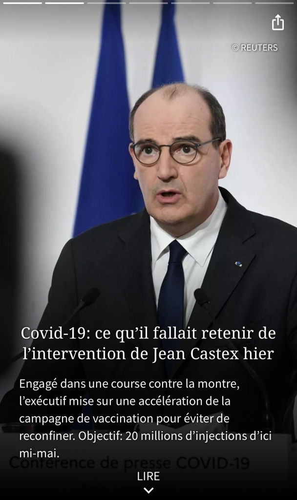 Le Figaro produit également un format matinal intitulé « Les 5 infos à connaitre ce matin », dans une mise en scène verticale permise par la technologie AMP-Story de Google.