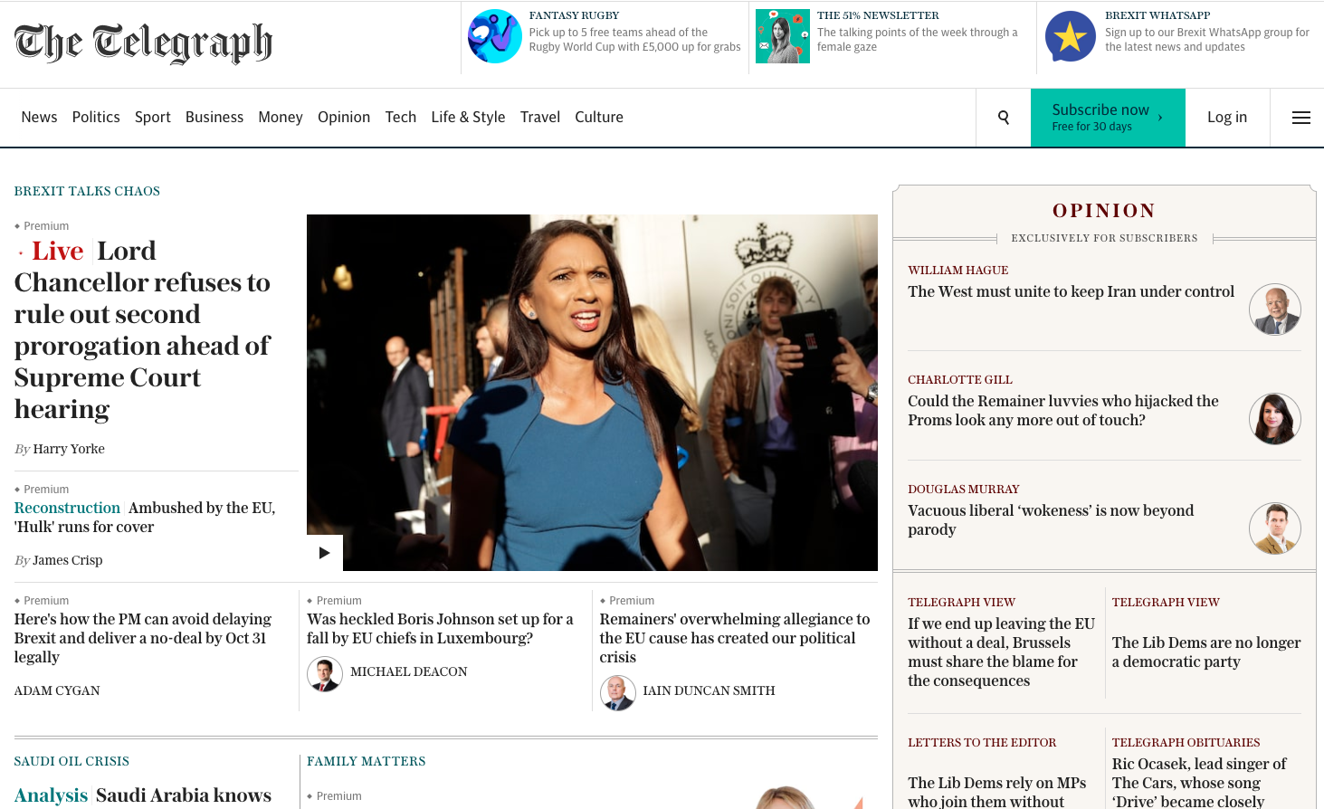 On peut aussi imaginer une mise en avant spécifique pour les contenus d'opinion, qui sont souvent mélangés avec les autres contenus (lire notre étude de cas). C'est pourquoi certains sites comme The Telegraph ou le New York Times affichent une zone claire et distincte pour rassembler ces contenus sur la une.