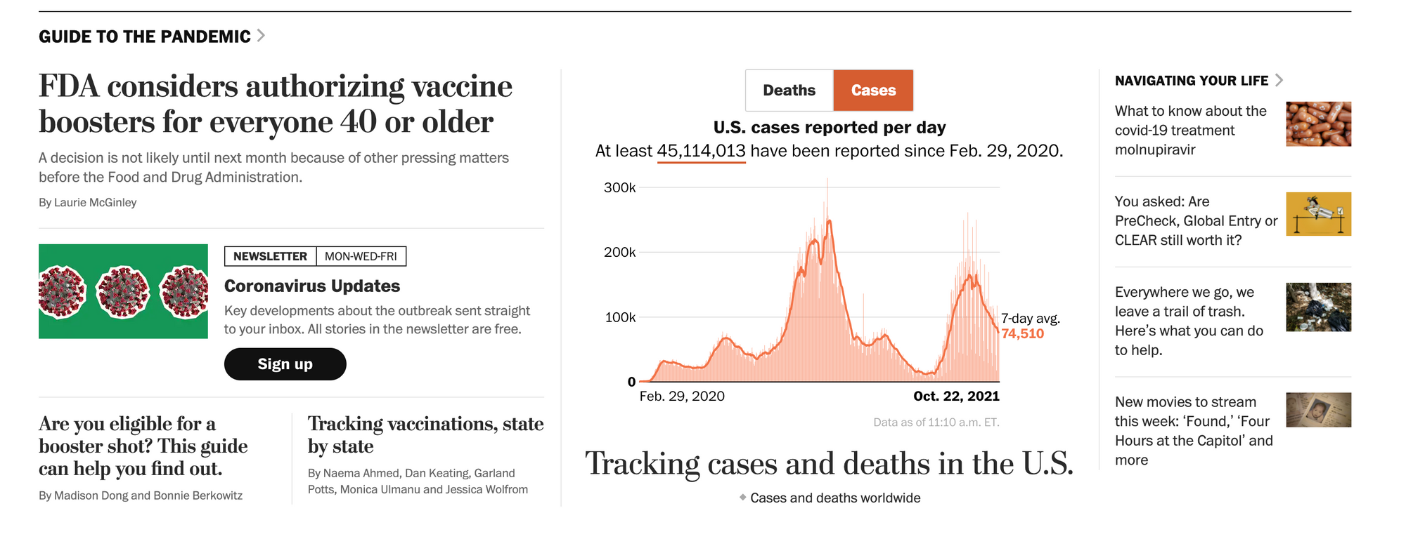 Au Washington Post, on peut aussi voir des dataviz sur la homepage, à l’instar de ce bloc de suivi Covid, très mis en avant.