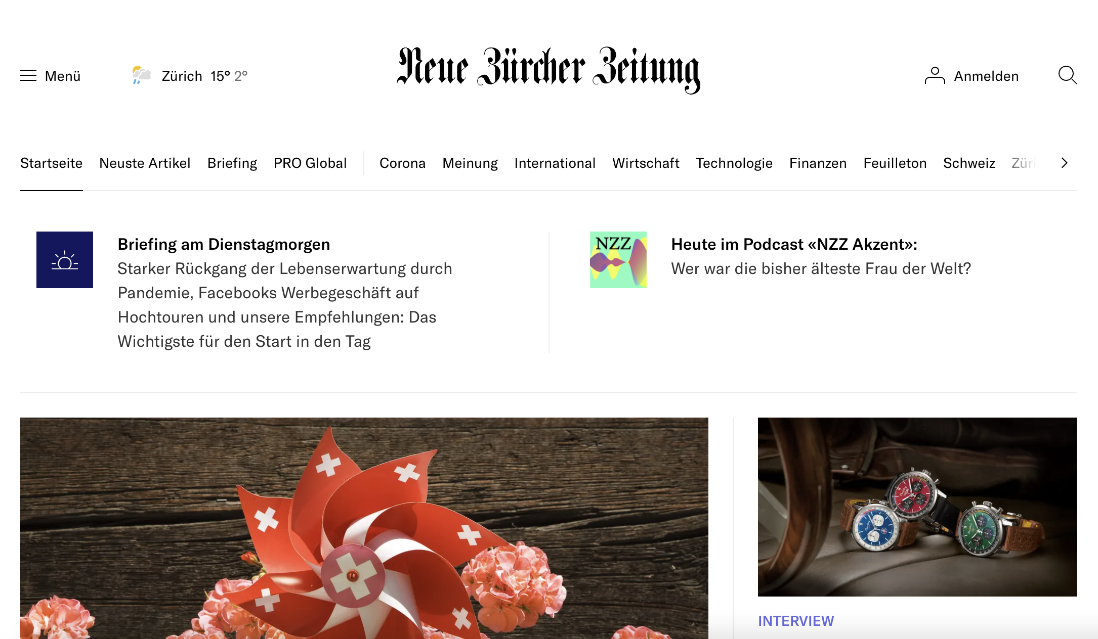 C'est aussi le cas du site suisse NZZ, qui affiche un bandeau spécial pour valoriser son brief et son podcast quotidien.