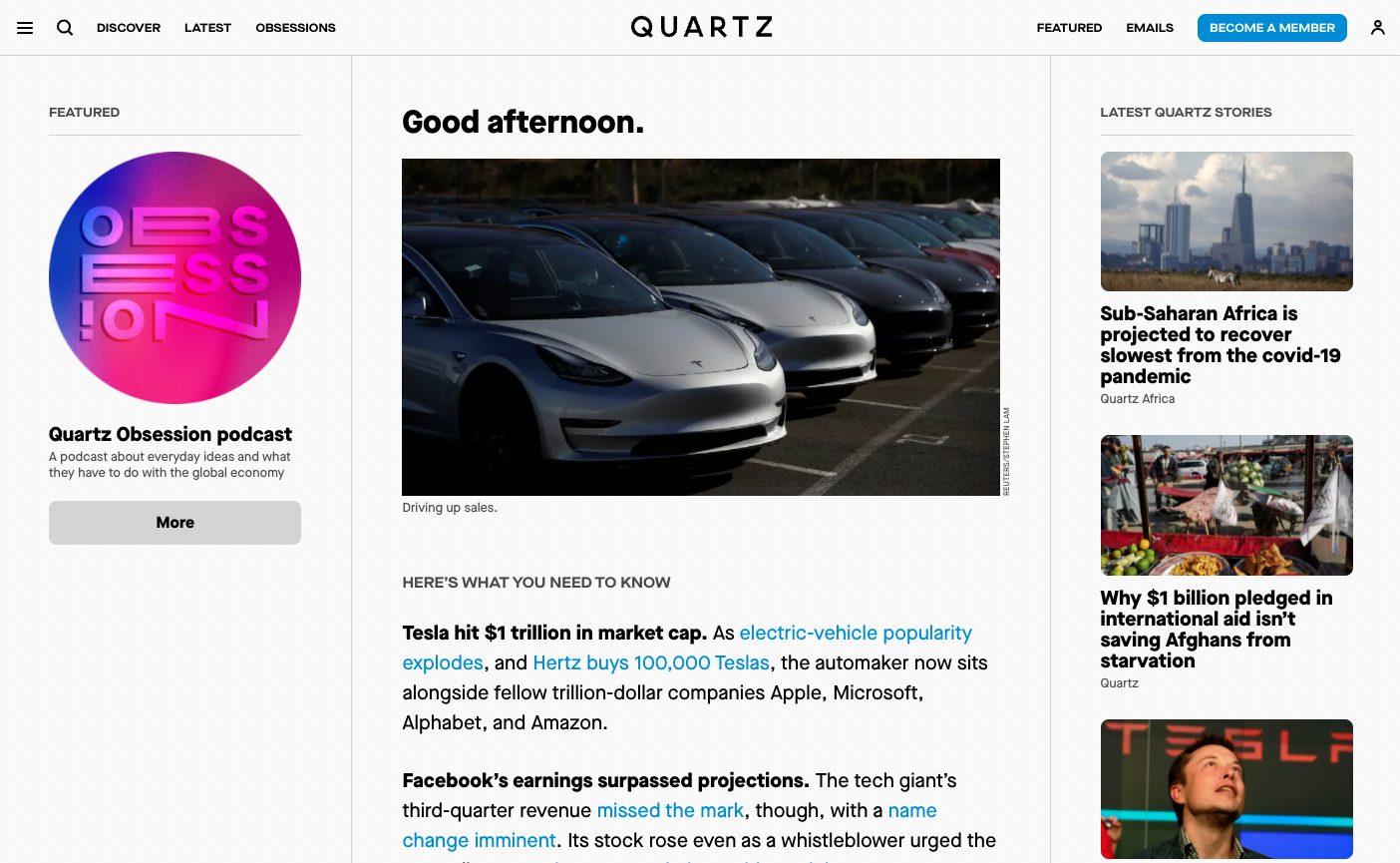 On peut également éditorialiser davantage ces pages stratégiques. On peut par exemple penser à Quartz et sa homepage assez radicale, qui prend principalement la forme d'un « brief » mis à jour régulièrement.