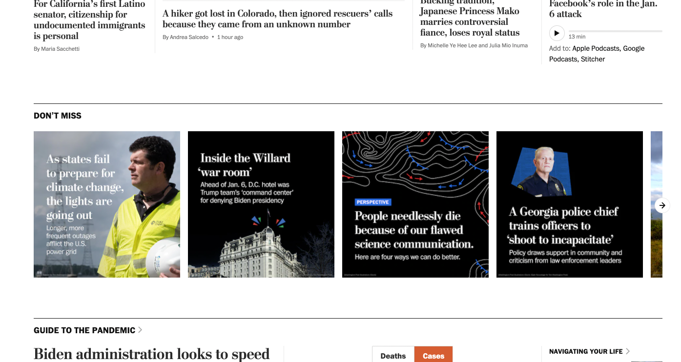 Le Washington Post est allé encore plus loin pour l'onglet « Discover » de son application mobile. Il permet d'explorer les actus du moment à travers des petites vignettes visuelles, qui rappellent les « artworks » de Netflix, dont l'importance stratégique est bien connue. La fonctionnalité est même devenue un argument fort dans la promotion de l'application mobile. Cette approche a aussi fait son apparition sur le site web du journal depuis peu.