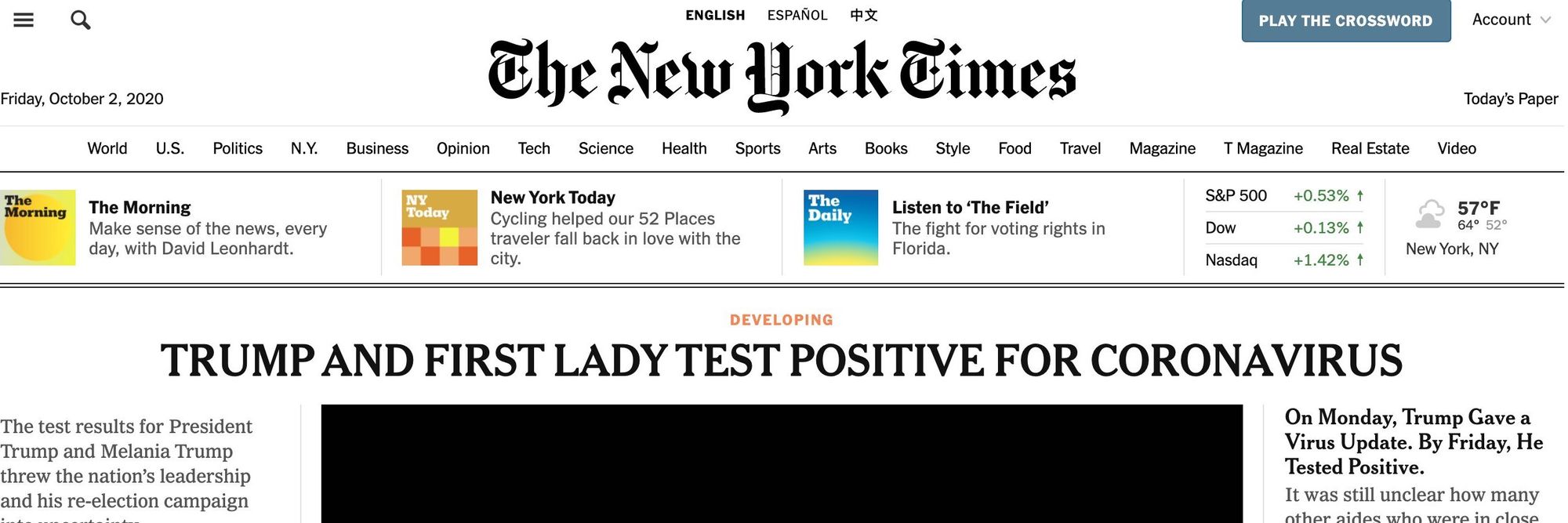 Le New York Times a encore une fois été précurseur, en ajoutant une barre de raccourcis tout en haut de sa homepage. Un bel écrin pour ses podcasts et newsletters, avec des titres qui changent tous les jours.