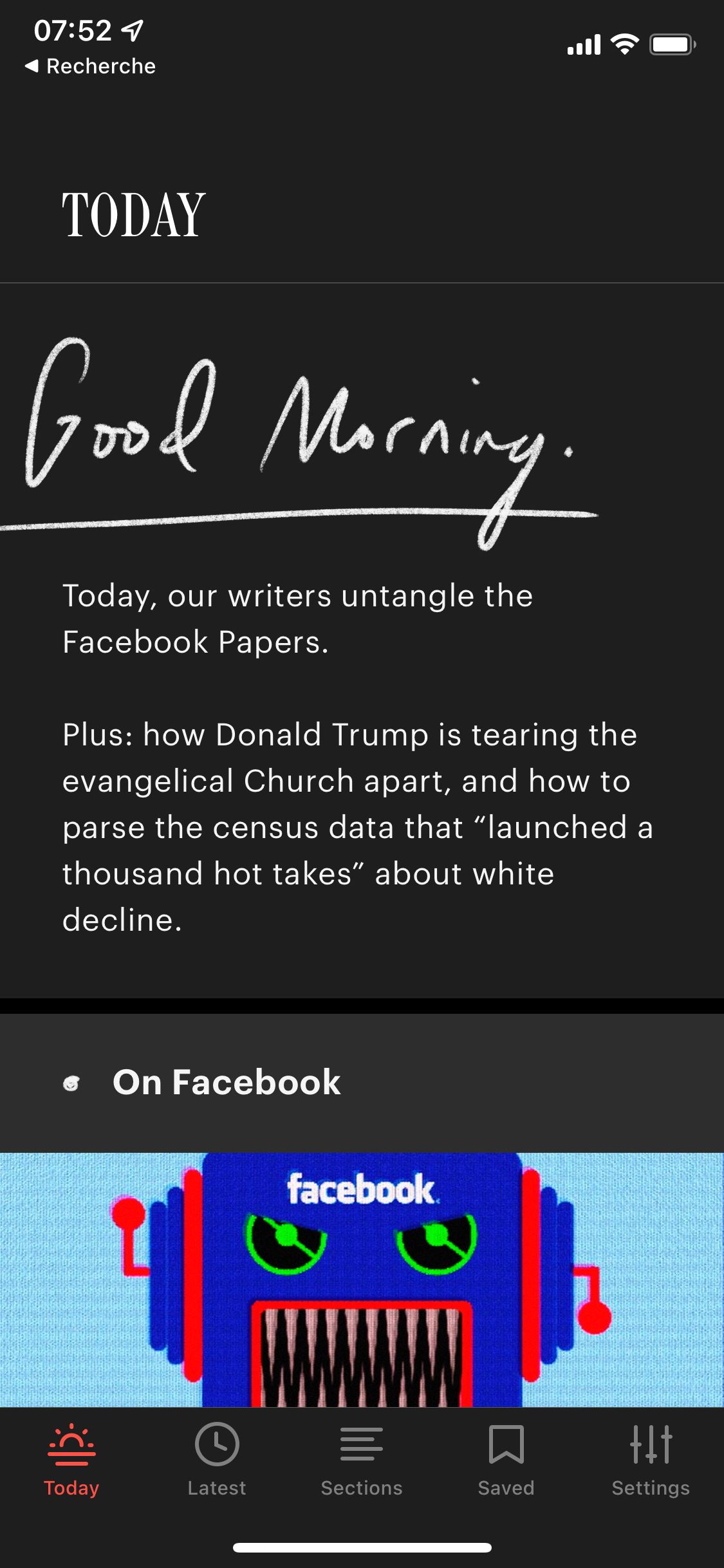 Citons aussi l'application mobile de The Atlantic, dont l'onglet principal est une sélection très éditorialisée, présentée à la façon d'une newsletter.