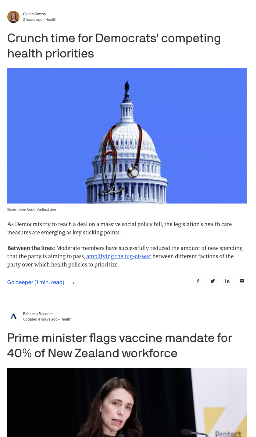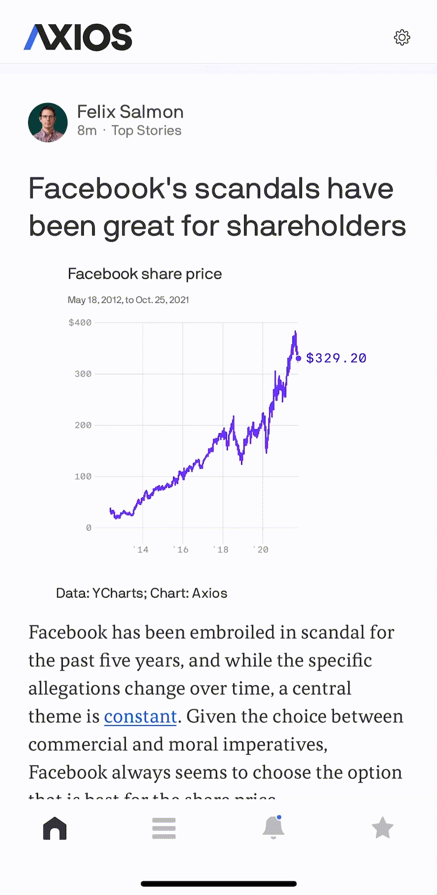 Pour aller plus loin, on peut aussi citer Axios, qui a aboli totalement la distinction entre la homepage et les articles. Dans son application mobile, on lit les articles directement sans sortir de la une, grâce à un système de contenus dépliants. Ça fonctionne très bien, notamment car les articles d'Axios sont plutôt courts.