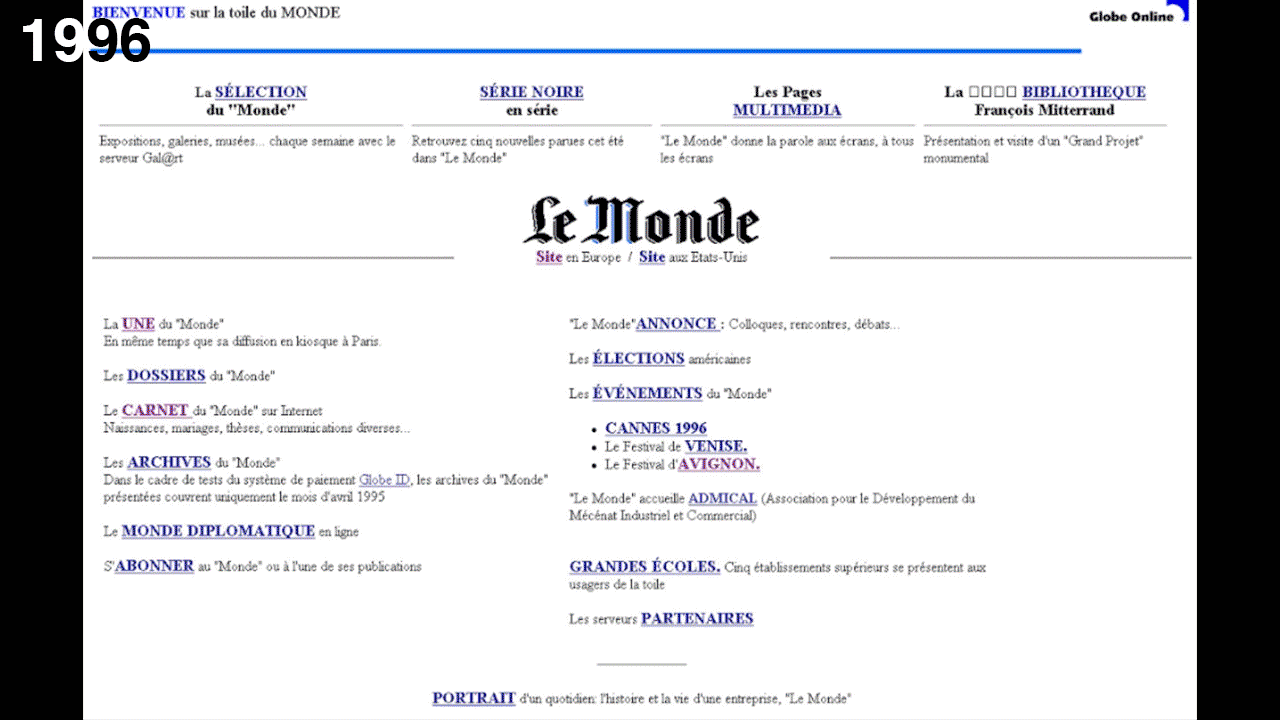 Ce GIF emprunté au Monde est en apparence éloquent. On y voit l'évolution chronologique de la page d'accueil web du journal, depuis sa création en 1995. En terme de graphisme c'est clair, on en a fait du chemin !
