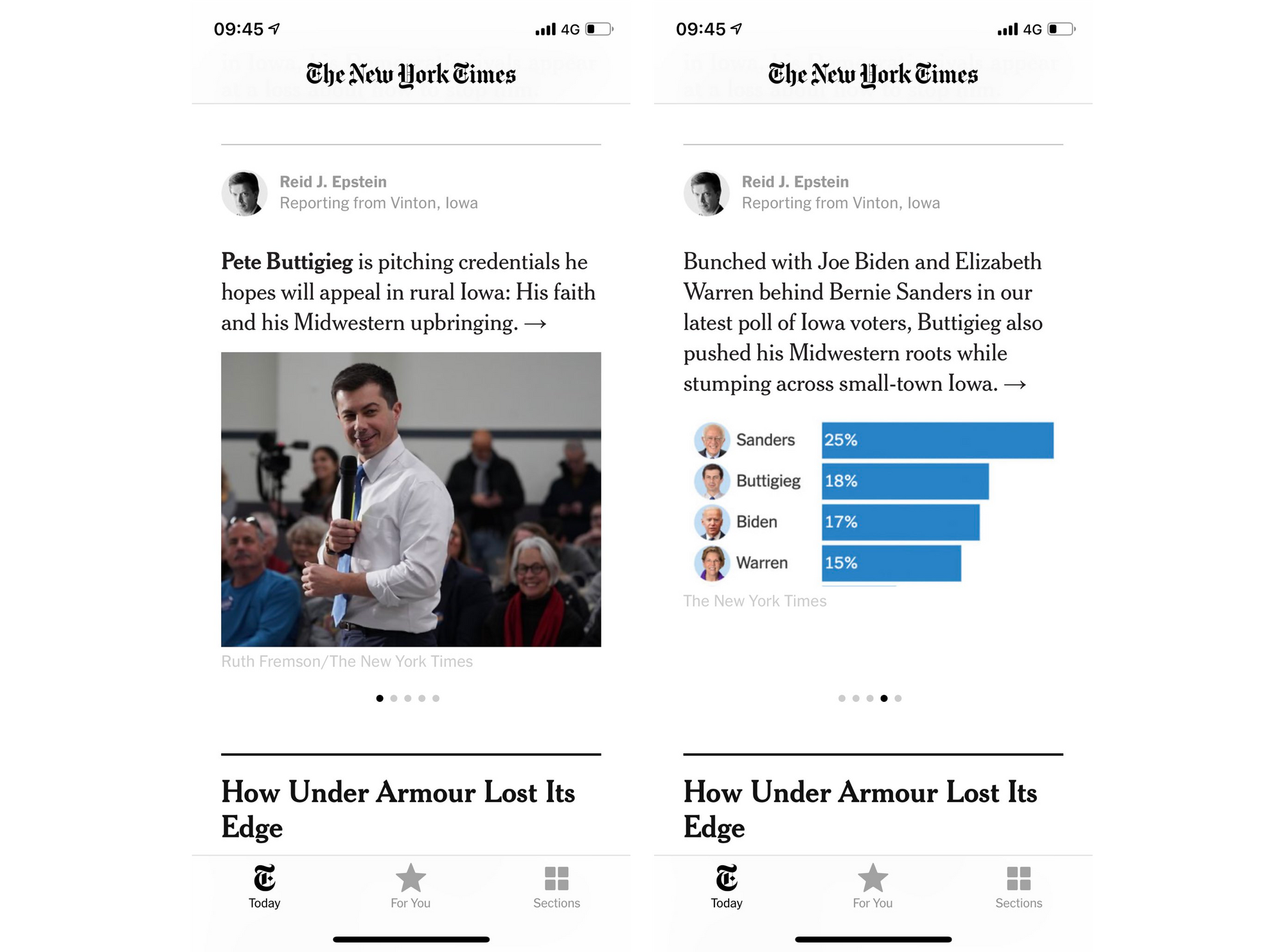 Dans la lignée d'Instagram, le New York Times expérimente depuis 2020 des petites capsules à swiper sur son site mobile et son application. L'originalité est que ces carousels ne sont pas destinés à promouvoir des articles mais sont de véritables contenus qui se consultent à la volée. Le NYT y distille des petits décryptages très concis, découpés en plusieurs écrans, dans un savant mélange de texte, image, data et vidéo.