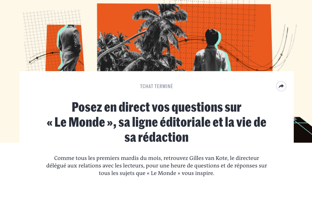 Depuis février 2021, Le Monde organise ainsi un live chat mensuel sur tous ces sujets. Avec des discussions souvent très intéressantes entre le journaliste Gilles Van Kote et les lecteurs. Les questions qui « fâchent » ne sont pas occultées : celle sur l’influence de Xavier Niel dans la ligne éditoriale du journal est par exemple un running gag récurrent.