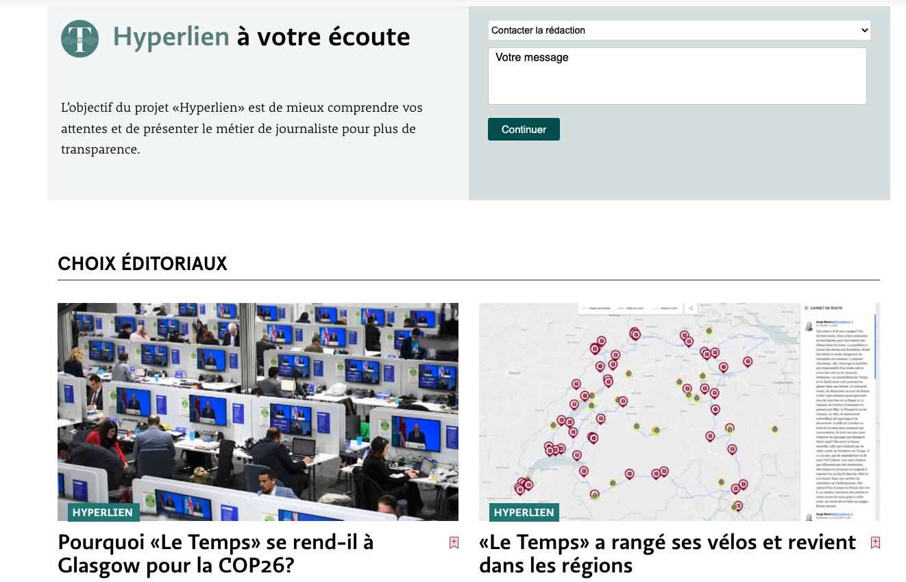 Le journal suisse Le Temps a par exemple créé la rubrique « Hyperlien » qui répond à plusieurs besoins : expliquer certains choix éditoriaux contestés, raconter la vie de la rédaction, relayer les retours des lecteurs... On peut toutefois regretter que les articles soient de moins en moins nombreux et plus timides ces derniers temps. Plus près de chez nous, le site d’investigation locale Mediacités publie aussi régulièrement dans sa rubrique « La Fabrique ».