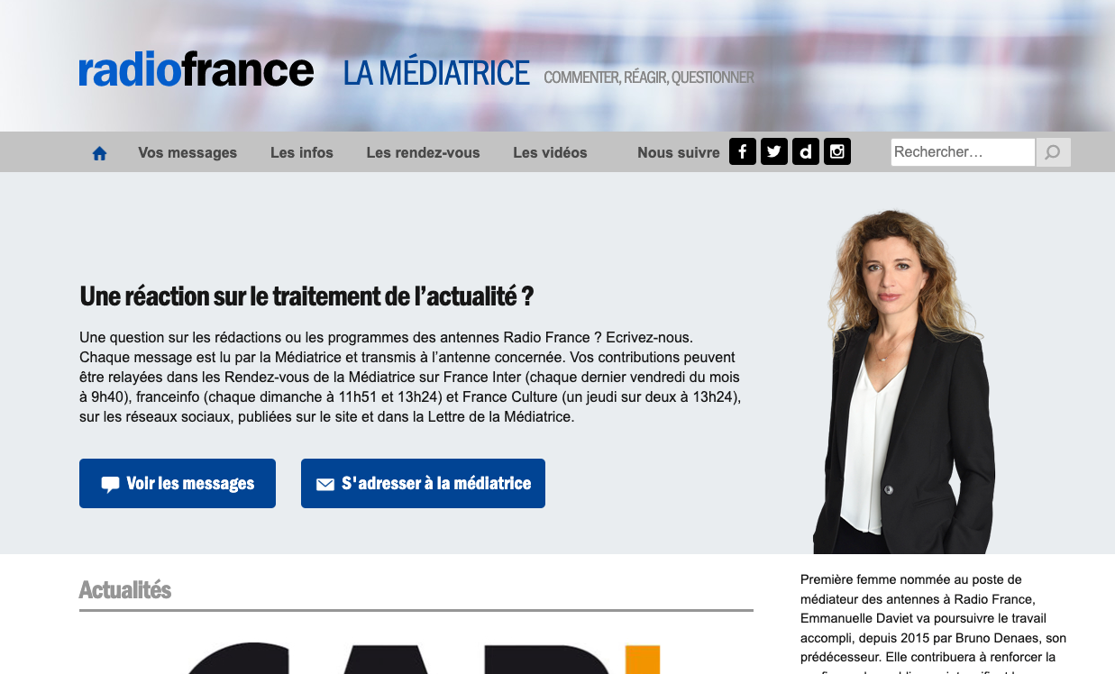 C’est par exemple le cas de Radio France, dont la médiatrice Emmanuelle Daviet dispose d’une page web archivant les messages reçus, d’une newsletter hebdomadaire, d’un compte Twitter et surtout de chroniques régulières sur les antennes.