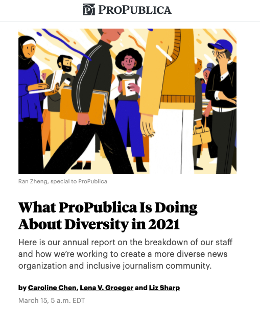 On peut citer le média américain ProPublica qui publie chaque année ses statistiques en matière de diversité des équipes, assorti d'un plan d'action détaillé.
