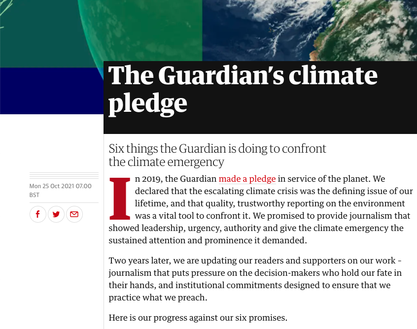 Ou encore The Guardian, très en pointe sur les problématiques environnementales, qui publie depuis 2019 des engagements forts en la matière. Le journal s'est ainsi engagé à refuser toute publicité liées aux énergies fossiles ou à diminuer ses propres émissions de 67% d'ici à 2030.