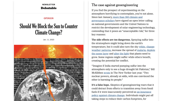Sur des sujets de fond complexes ou polémiques, on peut aussi imaginer des formats éditoriaux plus exigeants afin de mieux comprendre le raisonnement de chaque partie prenante. C’est par exemple le cas de la chronique hebdomadaire “Debatable” du New York Times, où un journaliste tente de synthétiser tous les arguments opposés sur une question de fond. Une ouverture sincère sur divers points de vue… et in fine le lecteur peut se faire sa propre opinion.