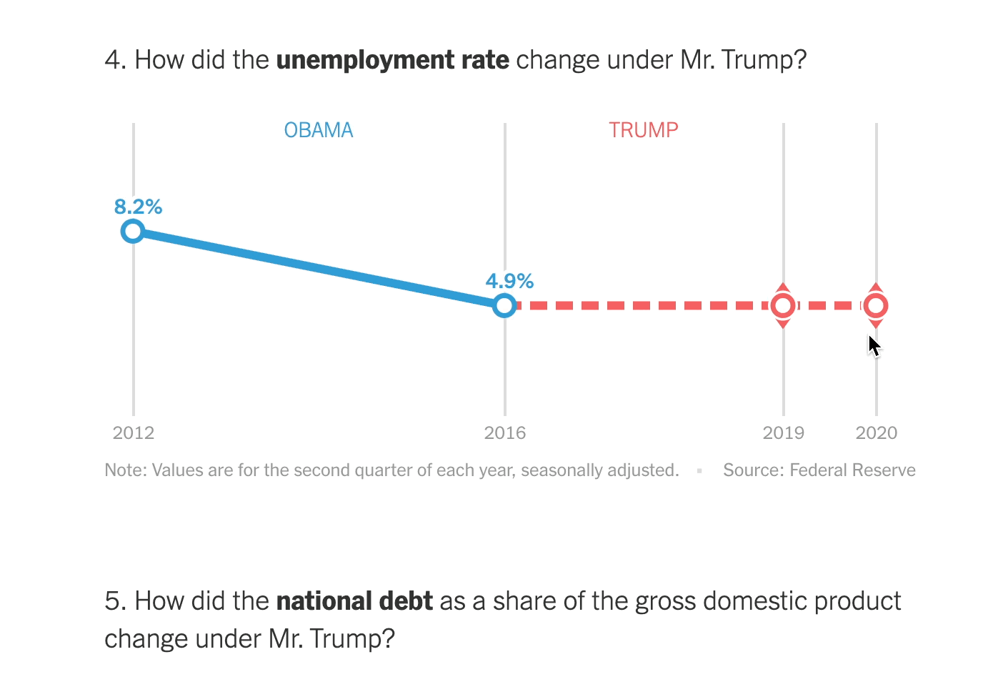 Le format marche aussi très bien pour des statistiques : il suffit de présenter un graphique et de laisser le lecteur compléter la fin de la courbe, par exemple. Très efficace pour s’attaquer à des totems clivants mais pas toujours bien maîtrisés, comme ici le bilan économique de Donald Trump.