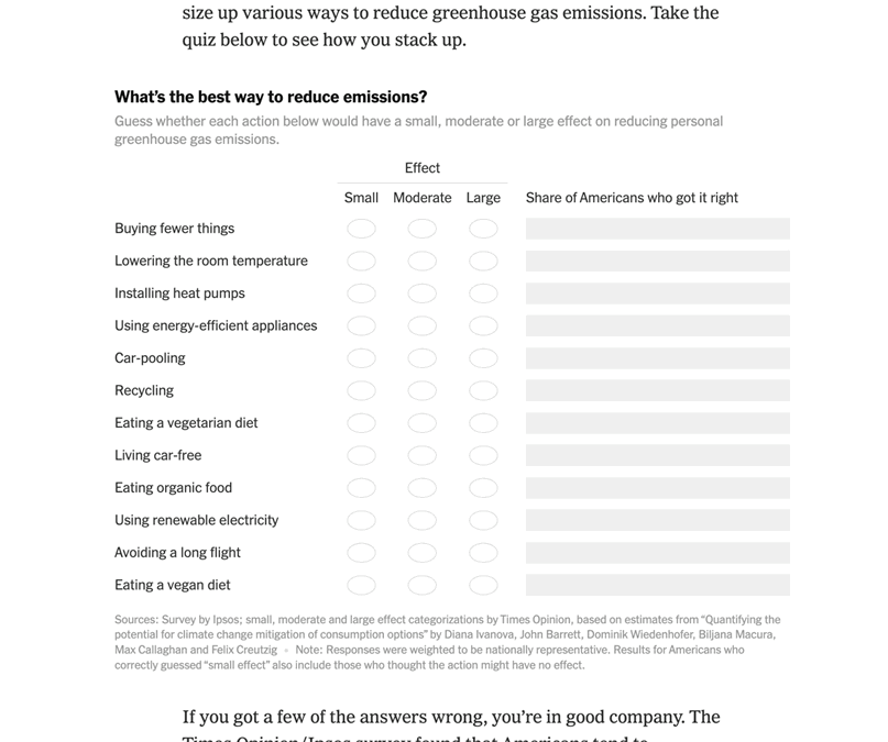 Certains médias utilisent pour cela des éléments interactifs, comme ce mini-quiz du New York Times qui invite les lecteurs à deviner les leviers individuels les plus efficaces pour réduire son empreinte carbone. Le quiz est proposé en début d’article et suivi d’un décryptage. Le gimmick interactif vient responsabiliser le lecteur, qui doit d’abord mobiliser ses connaissances sur le sujet, avant d’éventuellement critiquer l’analyse du journaliste.