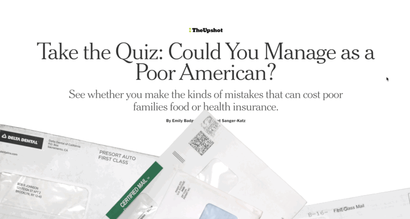 On peut citer cet article du New York Times qui interpelle le lecteur de manière assez frontale sur la question des démarches administratives auxquelles font face les Américains les plus pauvres. L’accroche “Vous en sortiriez-vous si vous étiez pauvre ?" a le mérite de remettre à leur place les potentiels donneurs de leçons — qu’on croise souvent dans les espaces de commentaires des sites d’info. L’article propose ensuite un quiz, suivi d’un article plus classique qui rebondit sur les réponses moyennes des lecteurs.