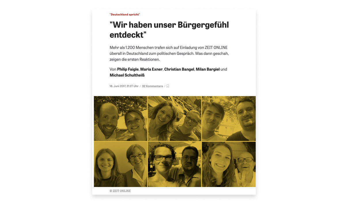 Un cran plus loin, les médias allemands Die Zeit et Der Spiegel ont organisé plusieurs grandes campagnes nationales à grande échelle pour faire dialoguer des citoyens aux opinions diverses.