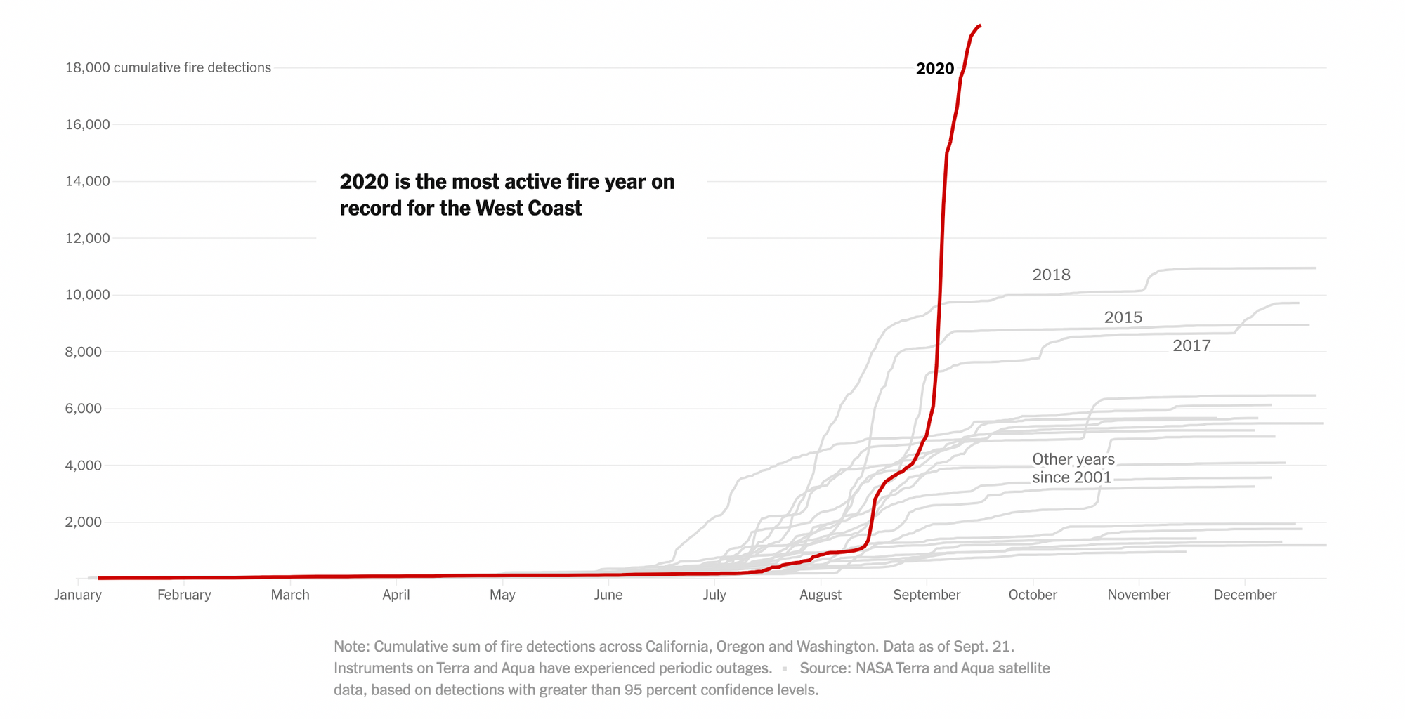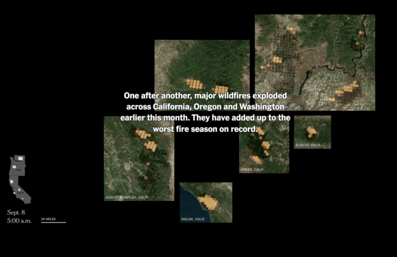 Après une année 2020 particulièrement riches en incendies dans l’Ouest américain, le New York Times a produit ce grand format pour insister sur l’intensification indéniable du phénomène.