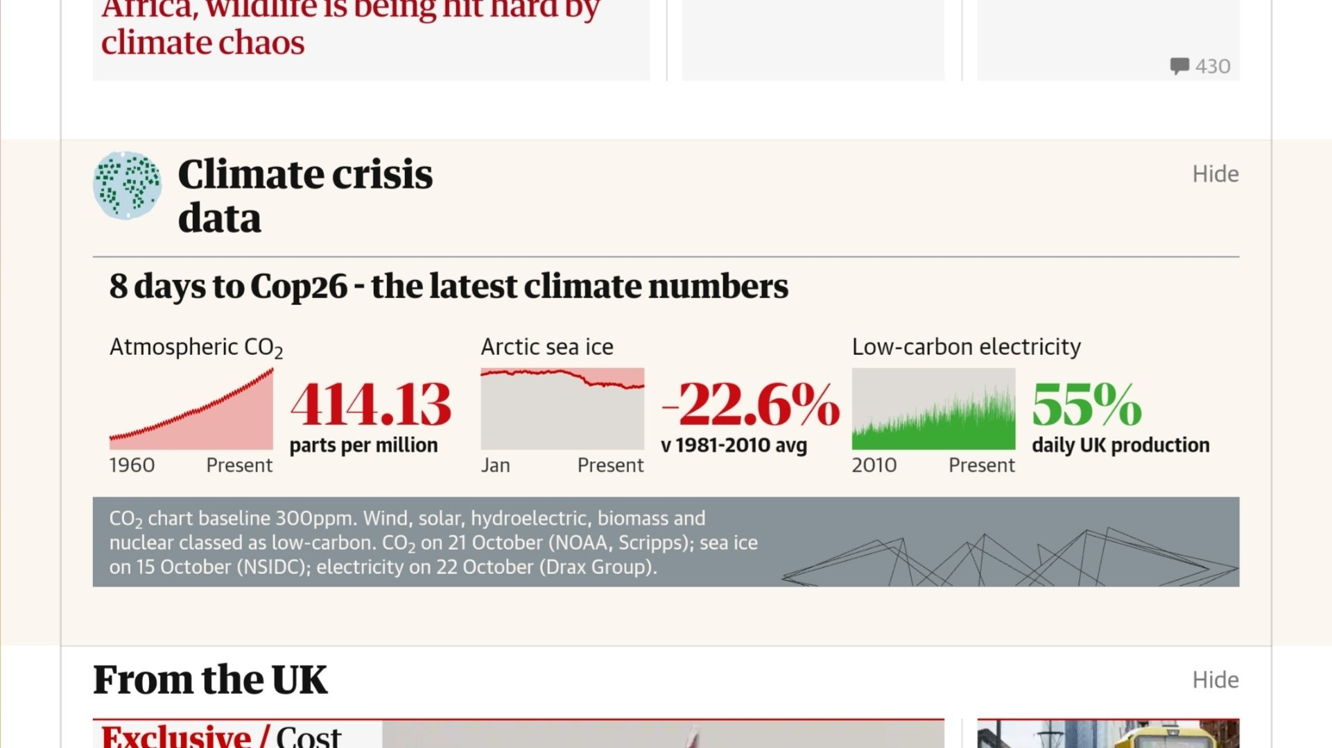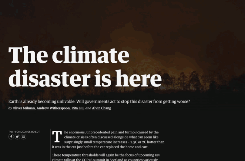 The Guardian a par exemple mis en avant 3 chiffres clés sur sa page d’accueil pendant toute la durée de la Cop26 — on peut regretter qu’il ne le soit pas de façon permanente. Notons que le site a eu le bon goût d’inclure un chiffre plus positif, en vert, pour déjouer le piège classique d’une couverture trop anxiogène.