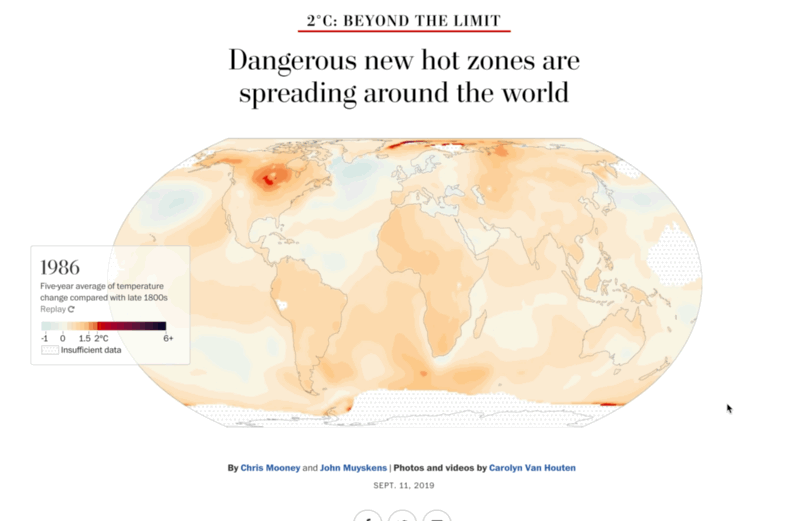 Le Washington Post a conçu cette chronologie animée du réchauffement au niveau mondial : une façon simple de montrer son amplification coordonnée à l’échelle du globe, sur une échelle longue.