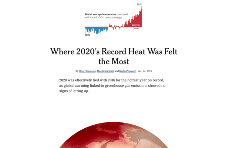 Le New York Times se penche lui sur une fenêtre temporelle plus courte, en se focalisant ici sur les températures record accumulées en 2020 dans le monde. Un globe animé permet de visualiser les régions les plus touchées, avec un court résumé des conséquences subies par les populations.