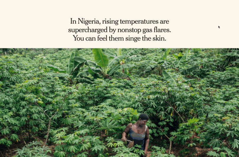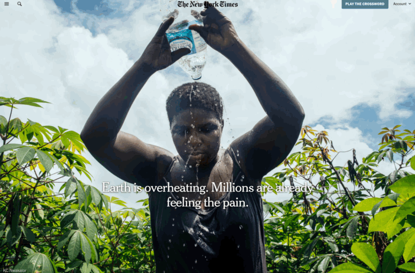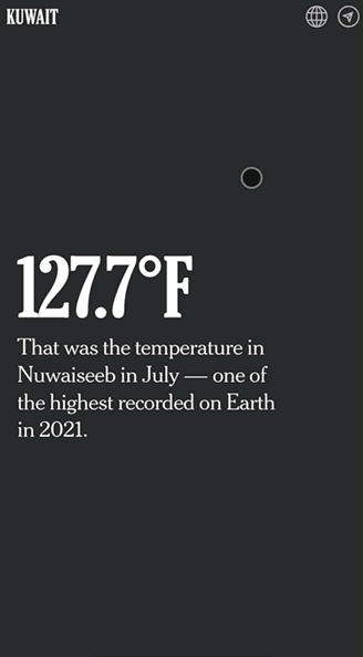 Le New York Times a quant à lui relevé le challenge de présenter sur une même page un panorama du changement climatique dans... l’intégralité des 193 pays. Le tout est pensé dans un format mobile-friendly, avec une petite histoire visuelle à balayer pour chaque pays.