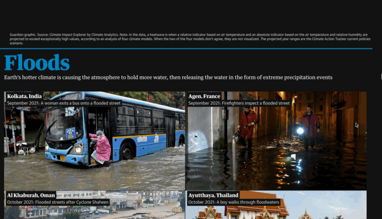 The Guardian synthétise extrêmement clairement les effets principaux du changement climatique, dans ce grand format qui mixe photographies et projections scientifiques. L’introduction donne le ton.